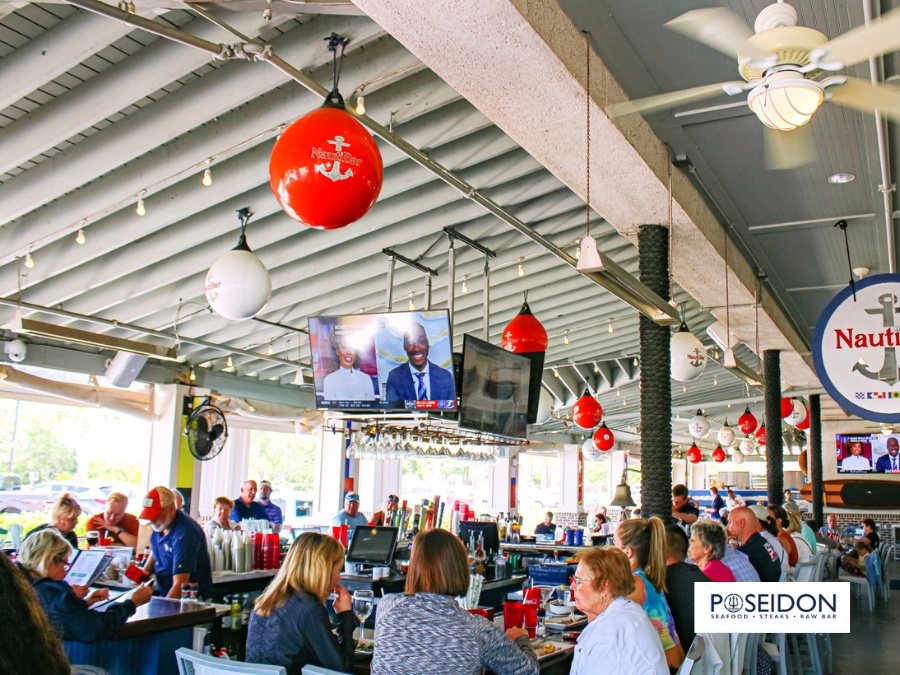 Floor-to-ceiling windows flood the restaurant with light, while the rooftop bar provides panoramic views of Broad Creek. The food is upscale yet accessible — fresh seafood, premium steaks, and craft cocktails that taste even better with a sea breeze. For groups that want to blend fine dining with a festive island vibe, Poseidon delivers effortlessly.